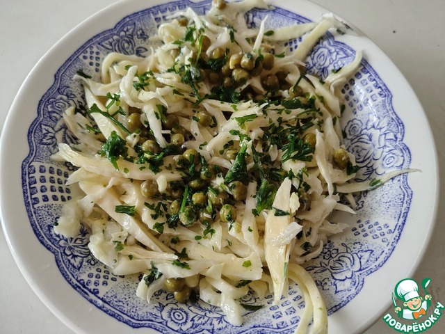 Мелко нашинковать капусту, лук, зелень. Подготовить горошек.
