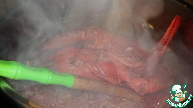 Когда макарончики готовы, возвращаем лобстеров в кастрюлю погреться.