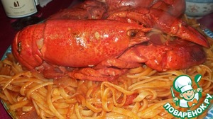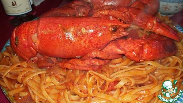 Подача: на большое блюдо выкладываем макароны, сверху лобстеры, разрезанные повдоль пополам.
