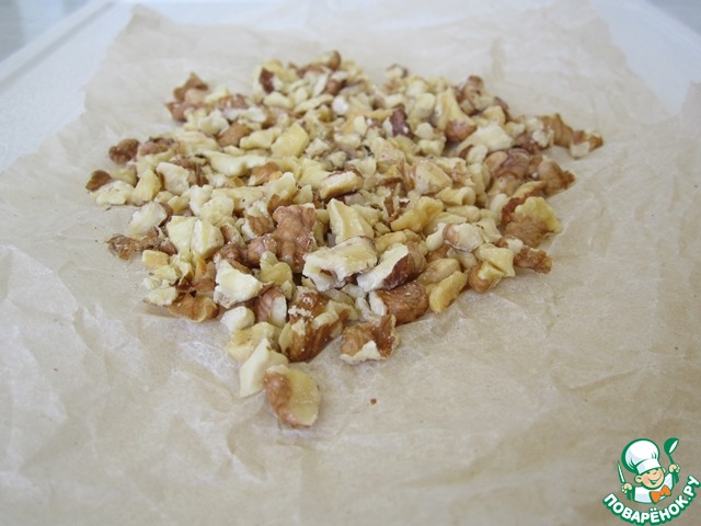 Первым делом нужно подсушите на сухой сковороде четыре столовые ложки грецких орехов.