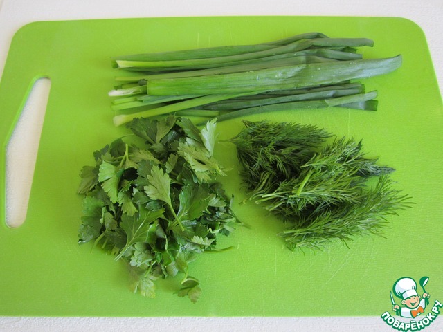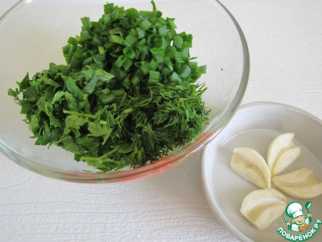 Нашинкуйте зелень укропа, петрушки и зелёный лук. Чеснок разрежьте пополам и уберите серединку.
