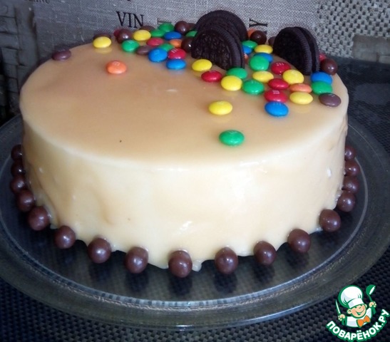Пропитанные коржи смазываем остывшей карамелью, накрываем четвертым коржом, упаковываем в пищевую пленку и отправляем в морозильную камеру.