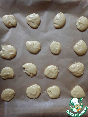 Выкладываем тесто ложкой на протвинь, застеленный пекарской бумагой.