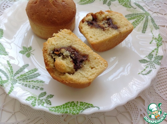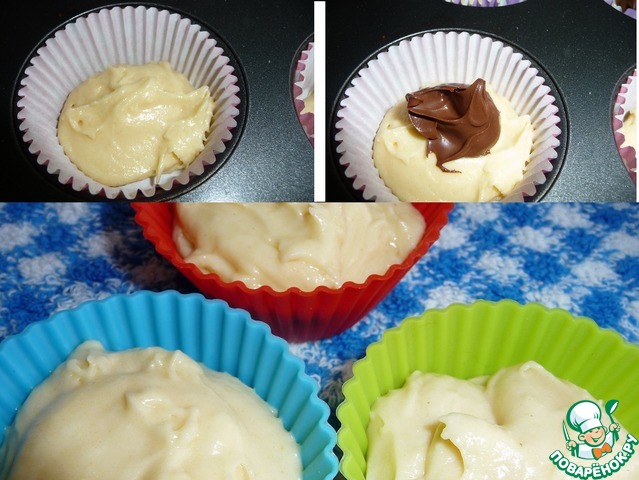 Формы для маффинов смазать маслом, силиконовые не смазывать. Я взяла бумажные вкладыши. Выложить столовую ложку теста, сверху 1/2 ч. л. нутеллы, затем тесто, слегка вдавливая и разравнивая. У меня получилось 15 шт.