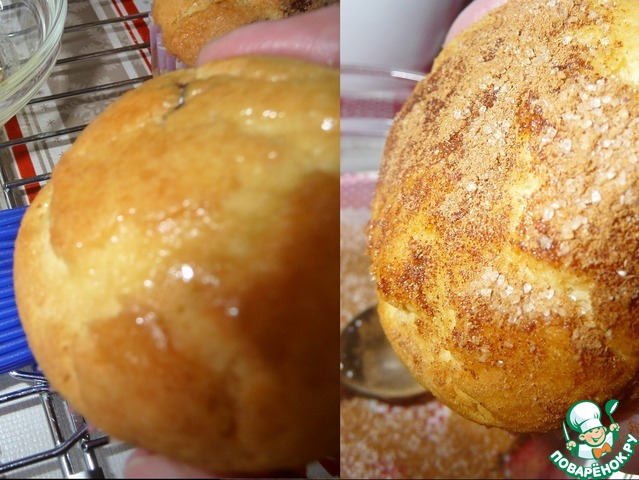 Дать маффинам немного остыть. Смешать корицу с сахаром. Растопить сливочное масло, смазать каждый маффин сверху и присыпать сахарно-коричной смесью.