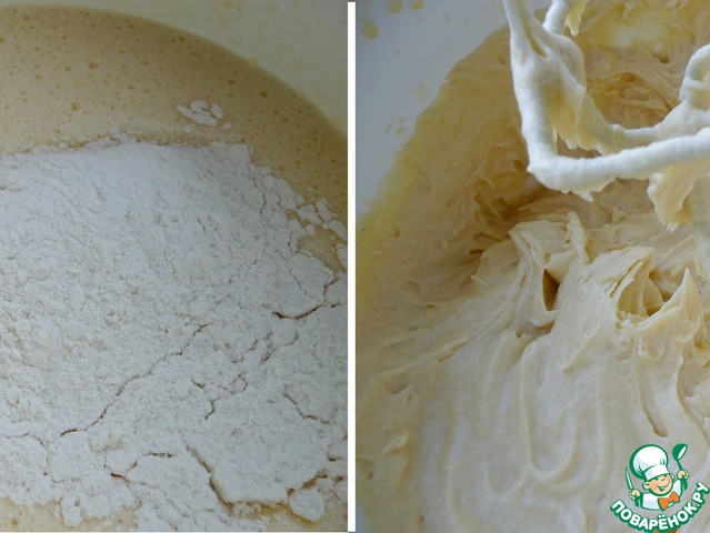 Кукурузную муку смешать с разрыхлителем, ввести в яично-маясляную-моло чную смесь, взбить.