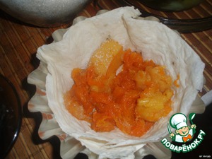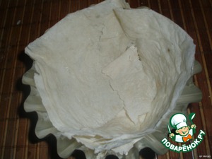 Лаваш режем на квадратики, смазываем растительным маслом и - в форму.