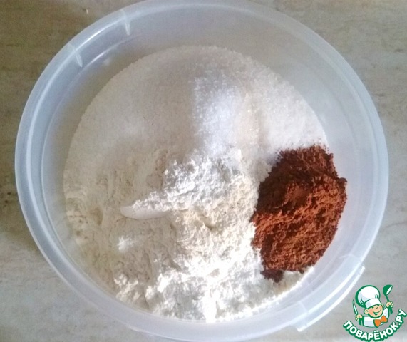 Муку смешиваем с сахаром, разрыхлителем и какао.