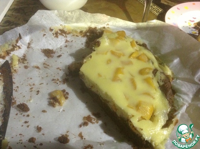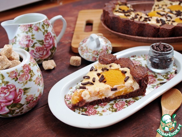 Предлагаю попробовать вкуснейшее лакомство: тарт из хрустящего шоколадного теста с начинкой из сладких персиков в нежном сметанном креме.