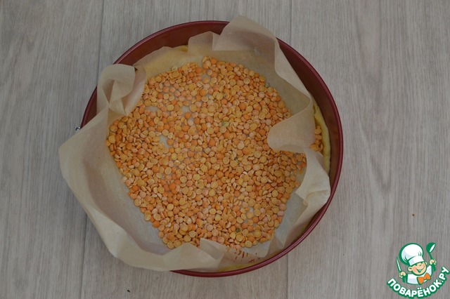 Дно наколоть вилкой, сверху положить пергамент с грузом (любые бобовые), выпекать в разогретой духовке при 180 гр 10 минут, затем снять груз вместе с бумагой и выпекать еще 10 минут. Дать остыть.
