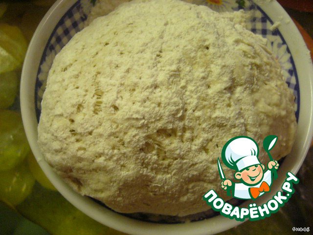 Тесто довольно загустело, положила в миску с мукой, потом, макая руки в муку, сформовала шар (подминая нижнюю часть теста в серединку, муки расходуется min, т. к. формуется хлебушек в руках, присыпанных мукой.