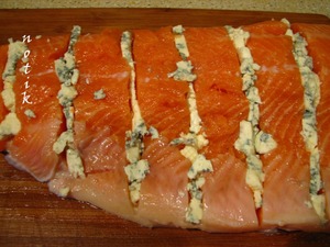 Сделать поперечные надрезы на расстоянии 2,5-3 см (прорезая до кожи и стараясь ее не повредить), полученные кармашки набить сыром.