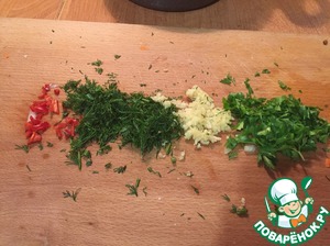 Зелень и перец мелко нарезать, чеснок пропустить через чеснокодавилку.