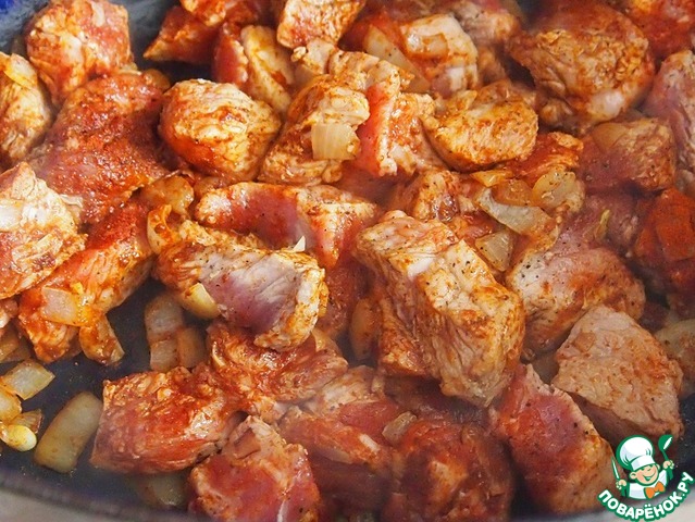 На масле поджарить мелко порезанный лук. Добавить порезанное на кусочки мясо. Посолить, поперчить, насыпать паприку. Закрыть кастрюлю крышкой, убрать огонь на минимум и тушить мясо в собственном соку, иногда помешивая.