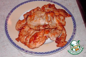 Солим, перчим курицу, жарим до золотистого цвета, вынимаем из сковороды.