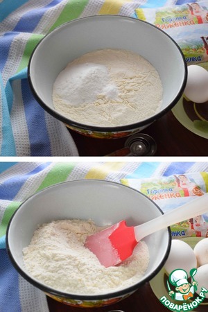 Муку просеять, добавить ванилин и разрыхлитель. Перемешать.