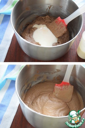 Добавить мягкое шоколадное масло и хорошо размешать лопаточкой.