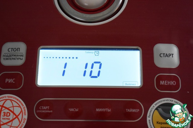 Выбираем режим "Выпечка", время - 1 ч. 10 мин. Можно испечь кекс в духовке: духовку разогреть до 180°С, тесто выложить в смазанную маслом форму Ø 20-22 см и выпекаем 40-45 минут. Ориентируйтесь по своей духовке!