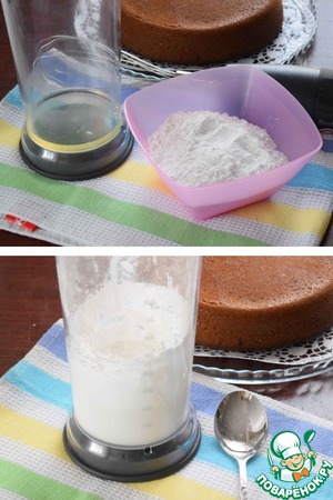 Пока остывает кекс, готовим глазурь. Яичный белок взбить в крепкую пену, не прекращая взбивания, небольшими порциями вводим сахарную пудру и взбиваем.