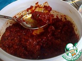А ТЕПЕРЬ САМОЕ ВАЖНОЕ - ЛАЗЫ: 0,5 кг. чеснока -измельчить (не рекомендутся использование "чеснокодавки" ), добавить 0,5 стакана острого красного перца (порошок), добавить 0.5 стакана сладкого перца (порошок). Можно еще добавить слегка обжаренный в масле, пропущенный через мясорубку 1-2 штуки сладкого болгарского красного перца и 1-2 острого, 1 ч. сахара. От этого лазы и само ашлям-фу получается очень красивым. И все залить РАСКАЛЕННЫМ растительным маслом (1 стакан), перемешать. Рекомендуется хранить в холодильнике. (Также очень вкусно использовать "лазы" с лагманом, и мантами, ГДЕ УГОДНО, для тех кто любит поострее)