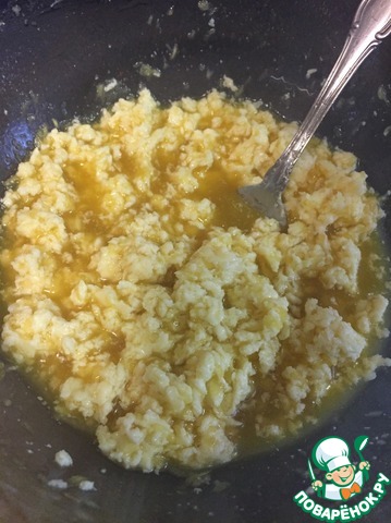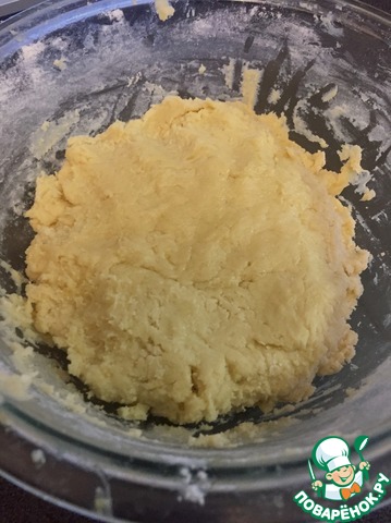 • Добавить муку, соединенную с разрыхлителем и замесить тесто. Накрыть пленкой и поставить в холодильник на 3 часа.