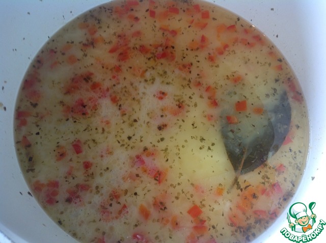Добавить перец, картофель, сладкую кукурузу, лавровый лист, майоран и мускатный орех. Влить бульон и довести до кипения. Убавить огонь до умеренного, накрыть крышкой и варить до готовности картофеля.