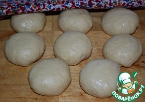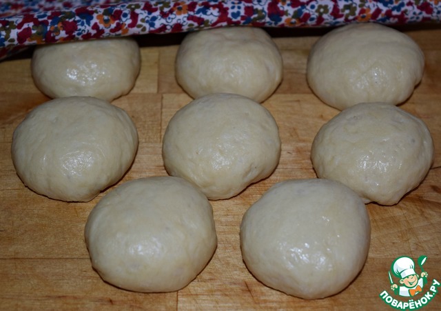 Подошедшее тесто выложить на рабочую поверхность, смазанную растительным маслом, обмять и разделить на несколько равных булочек. (8 штук по 75-80 г каждая) Прикрыть льняным полотенцем и оставить для "отдыха" на 5-10 минут.