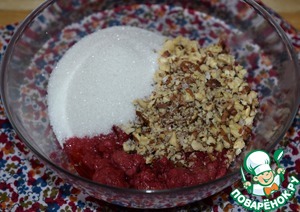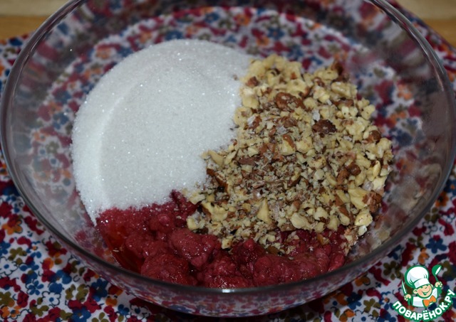 Малину заранее разморозить. Слить сок. Добавить к малине сахар и измельченные грецкие орехи. Перемешать.