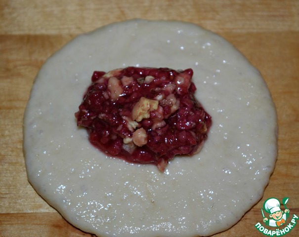 Из каждой булочки раскатать лепешку толщиной 0,5-0,7 см. В центр выложить по 2 ч. л. малиново-ореховой начинки.