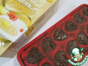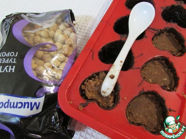 Подготовленные ячейки заполнить на 3/4 орехово-нутовым пралине, слегка утрамбовывая. Я делала это с помощью ложки.