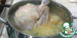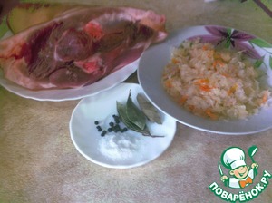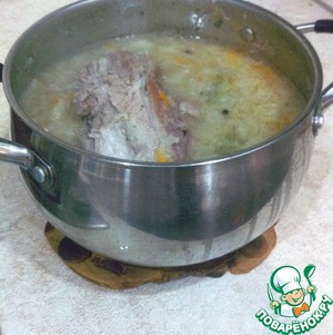 В кастрюлю наливаем холодной воды. Вода должна наполовину скрыть мясо. Ставим варить медленном огне. Отвариваем 1.5-2 часа. Затем добавляем квашеную капусту. Варим еще 20-30 минут. В конуе добавляем перец черный горошком, соль, лавровый лист.
