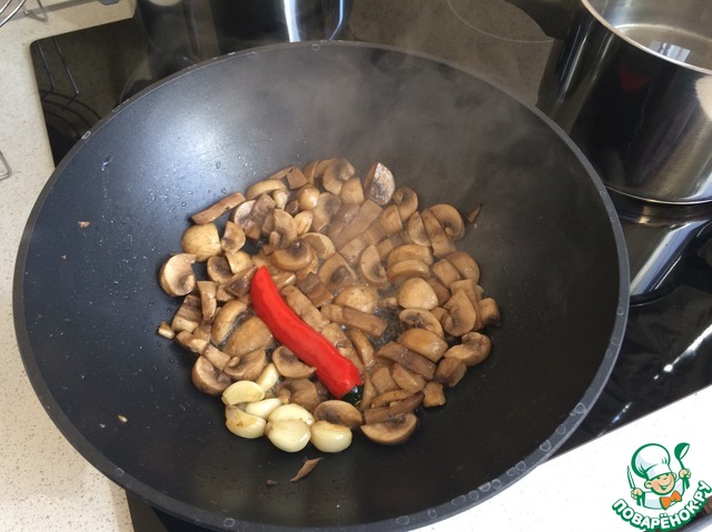 В сковороду налить 2 ст ложки масла. Выложить чеснок, чили и грибы. Готовить до полуготовности грибов. Как чеснок станет золотистым можно его убрать.