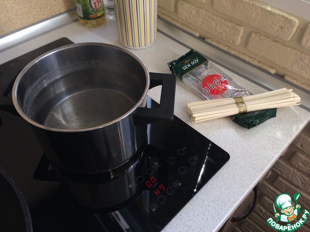 Вскипятить воду и закинуть лапшу удон. Солить не рекомендуется, так как соевый соус солью поделиться. Удон варить до состояния Al dente.