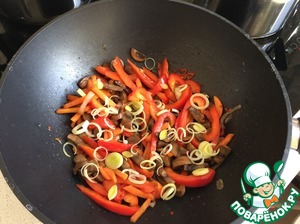 Когда морковь станет мягкой, добавьте болгарский перец и лук порей.