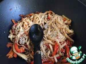 Добавьте соевого соуса и кунжут, готовьте 5-7 минут помешивая. Лапша готова)) Приятного аппетита!!!