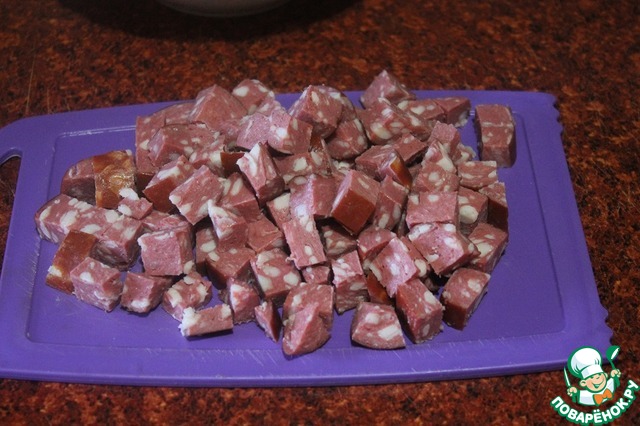 В сковороду наливаем масло. Добавляем колбасу. Обжариваем 3 минуты, периодически помешивая.