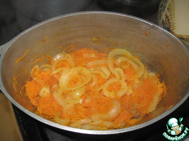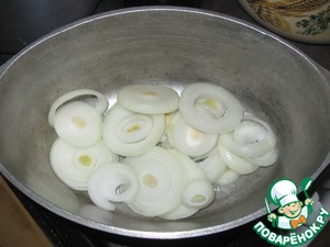 Для приготовления я использую гусятницу. На дно налить растительное масло, слегка спасеровать лук.