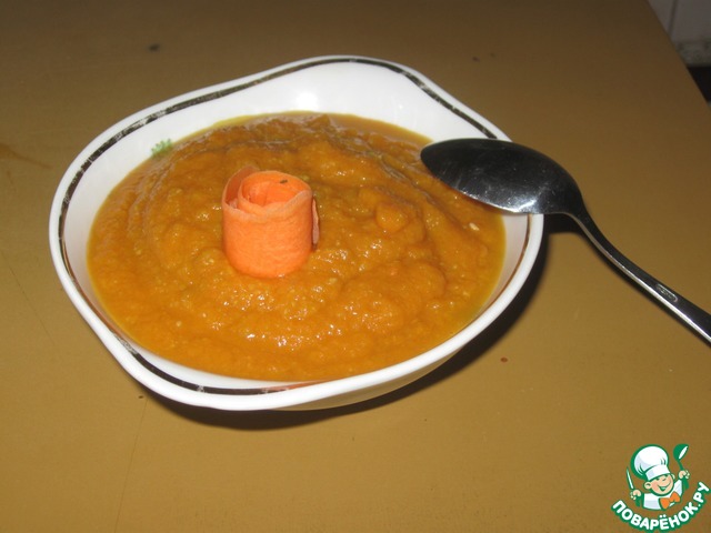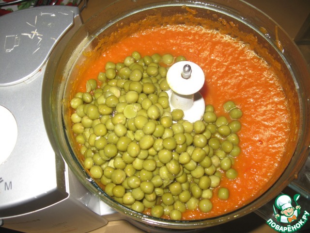 В процессе тушения выделилось много жидкости, шумовкой переложить в блендер, добавить зеленый горошек и перетереть. Специи добавить по вкусу, тут все зависит от индивидуальных предпочтений, сортов тыквы и морковки, кислоты томатного сока и т. п. Густоту тоже можно регулировать на свое усмотрение.