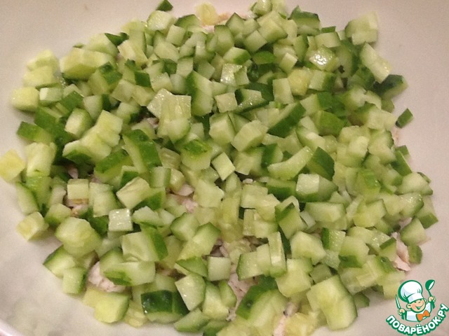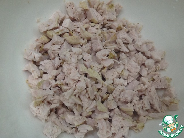 Куриное филе отварить или запечь. Остывшее порезать мелким кубиком.