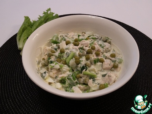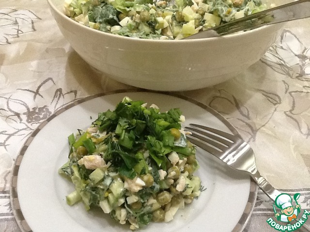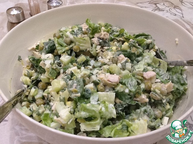 Когда я сделала этот салатик, моя старшая дочка сказала: "Ой, это почти Оливье! Только нет картошки, морковки, и есть салатный лист... Какой-то легкий!" Поэтому мы теперь так его и зовем " легкий почти Оливье". Когда хочется знакомого вкуса и в то же время уменьшить количество калорий в салатике, или просто сделать его полегче. При наличии готового отварного или запеченного куриного мяса, делается очень легко и быстро. И не зазорно подать на праздничный стол. Начнем готовить!