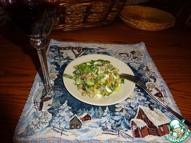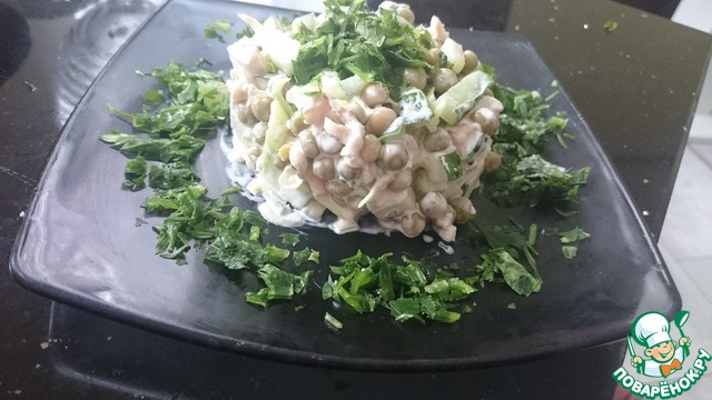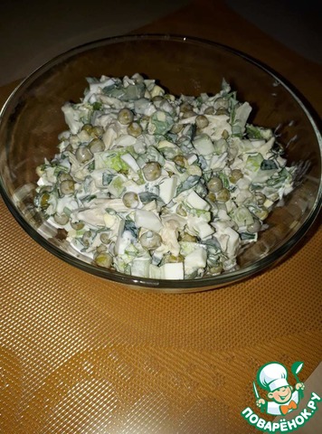 Банку горошка (нетто 245 г) открыть, слить жидкость, добавить в салатник.