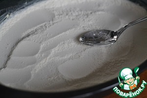 Смешать муку с разрыхлителем и сахаром.