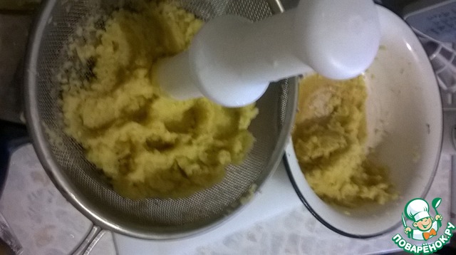Картофель очистить и натереть на мелкой терке или в мясорубке, комбайне. Отжать лишний сок через марлю. У меня не оказалось марли, я отжала через сито.