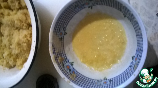 Осторожно слить сок, на дне собрался крахмал, его выкладываем назад к нашему тертому картофелю