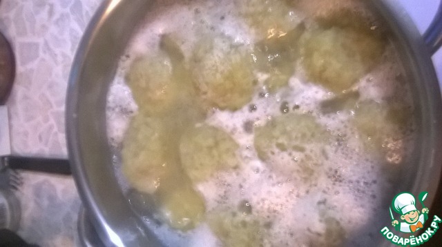 Скатывать шарики немного крупнее грецкого ореха и опускать в подсоленную кипящую воду.