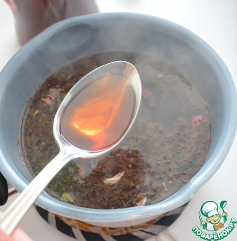 Вишню можно брать замороженную. Положите в ковшик чай (заварку), вишню (половину от указанного количества), бадьян и корицу.