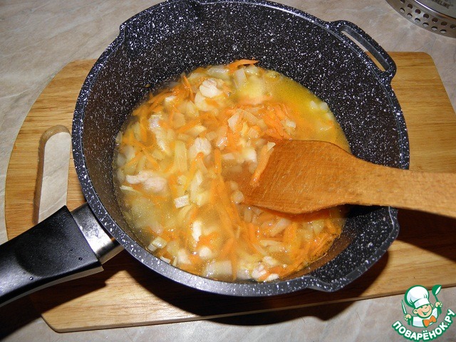 Добавить нарезанный лук и натертую на терке морковь, обжарить вместе до прозрачности овощей
