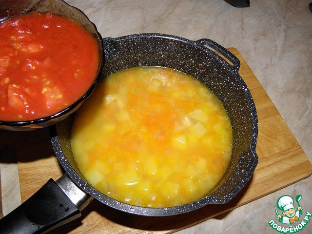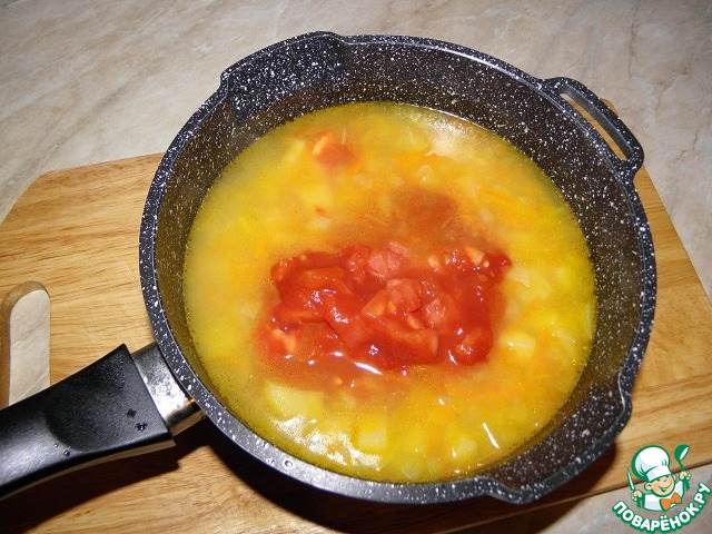 Все с уверенностью скажем, суп в меню нам очень важен! Вариант еще, друзья, вам хочу представить я! Легкий суп такой, приятный! С помидорами томатный! И куриное филе, на здоровье всей семье!