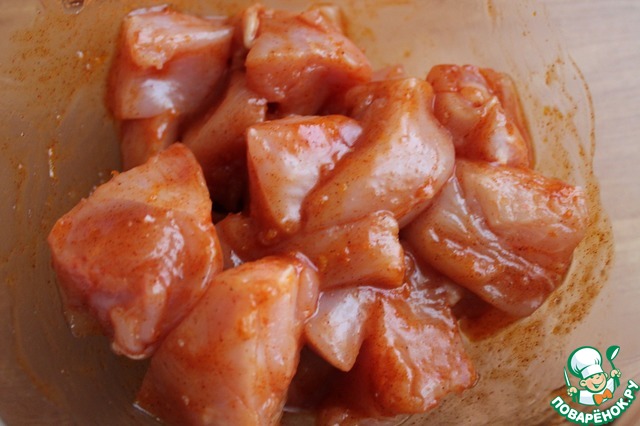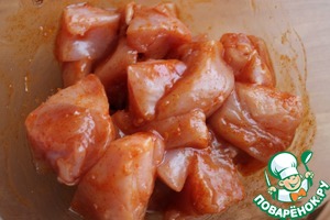 Полить маринадом курицу, перемешать и оставить на 30 минут.