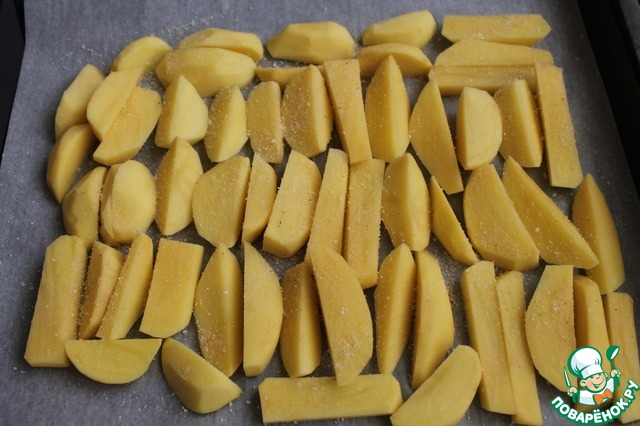 Картошку нарезать, выложить на противень, застеленный пергаментом, посолить и посыпать панировочными сухарями.